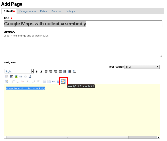 - Go to the object's edit form, select some text and choose Embedly link. TinyMCE makes the whole passage linked, so keep in mind that the whole passage will later be substituted with embedded map.