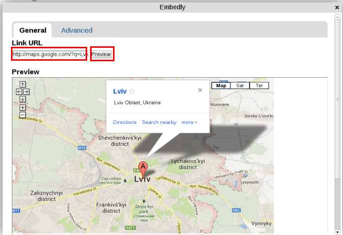 - Enter URL of the map from GoogleMaps. You can see the map preview by clicking on the button Preview.