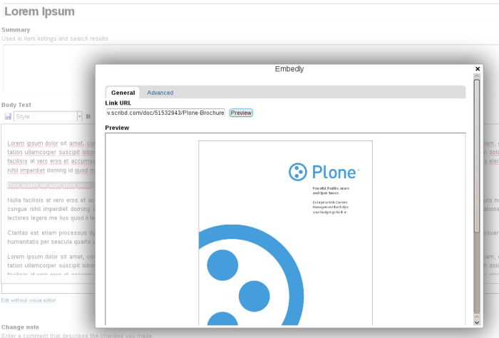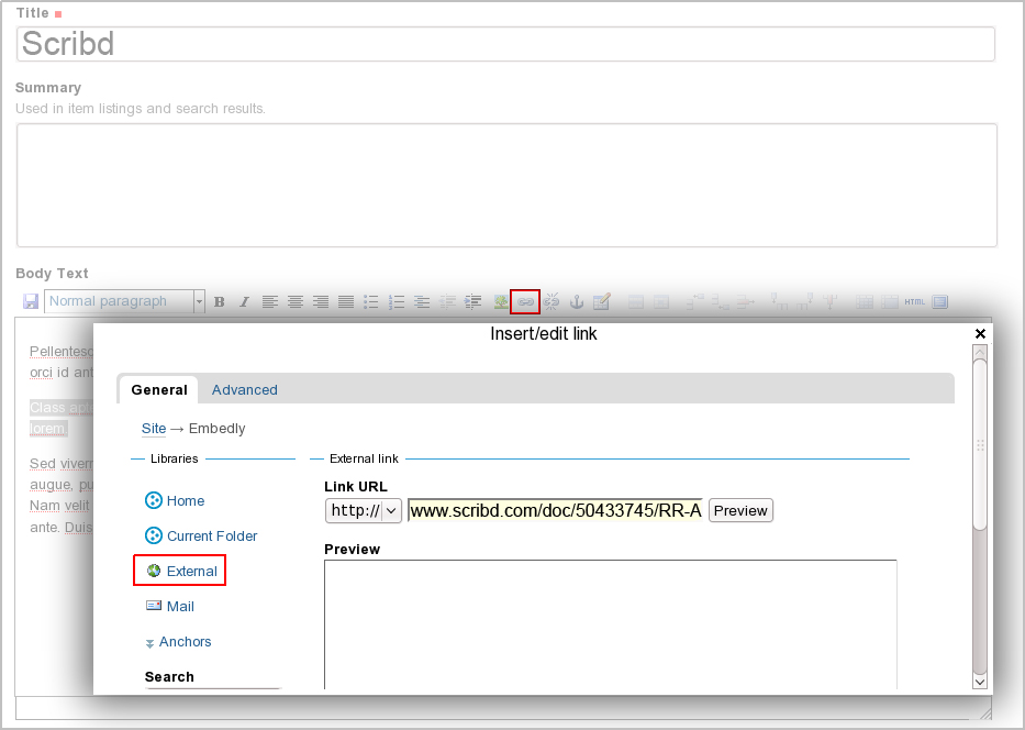 - Go to the object's edit form, click "Insert/Edit? Embedly link" on the toolbar.