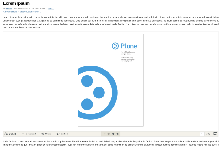 Use collective.embedly package to easily embed PDF files from scribd.com to your Plone 4 site. For this: