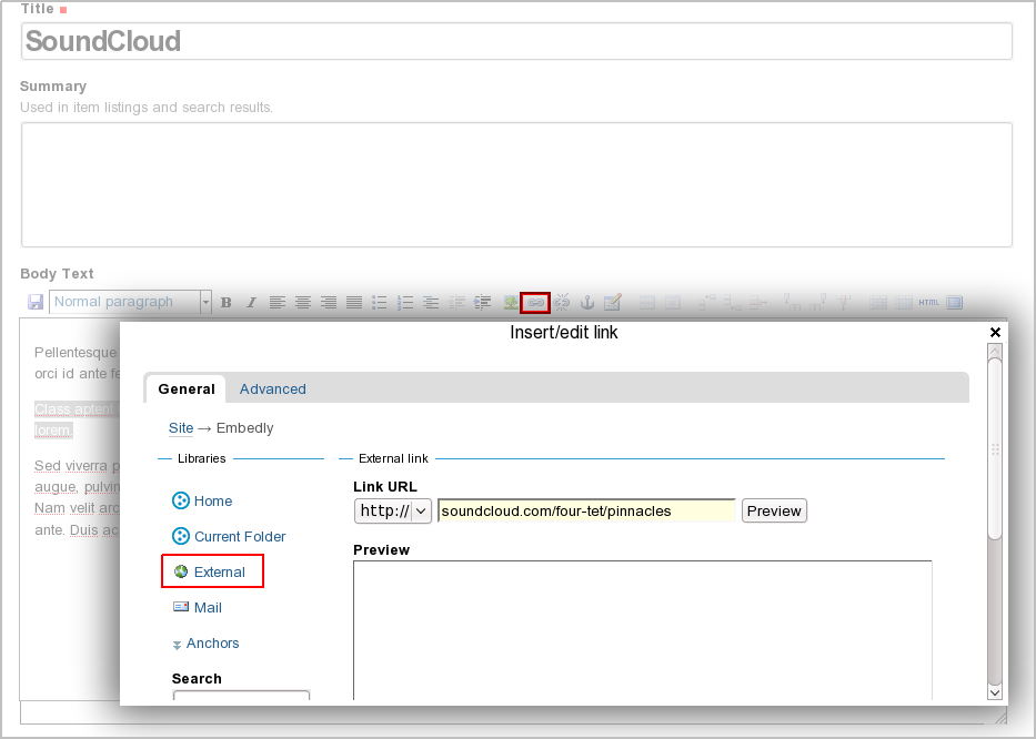- Select this text again and go to Insert link to insert the URL to the desired object on SoundCloud, e.g. http://soundcloud.com/four-tet/pinnacles