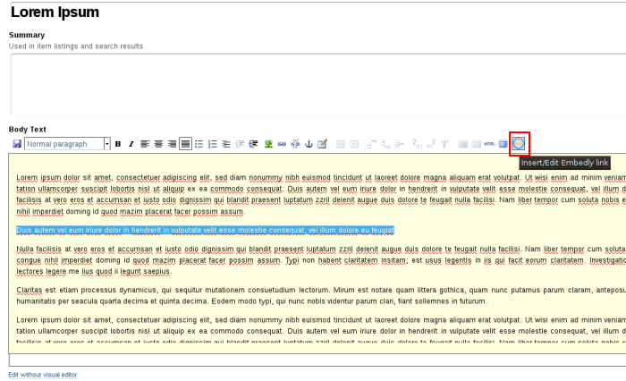 - Go to the object's edit form, select some text and choose Embedly link style for it
