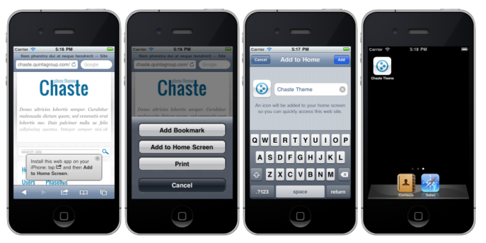 The web application places a pop-up message asking the user to add your website to the home screen. Version 0.1 of the product takes advantage of iOS5 native fixed elements positioning and seamlessly degrades to a javascript only version on iOS4.