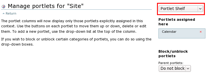 - add shelf portlet on a page where you want to add a carousel - click Manage portlets in one of the columns of your site and choose Portlet Shelf from Add portlet... menu;