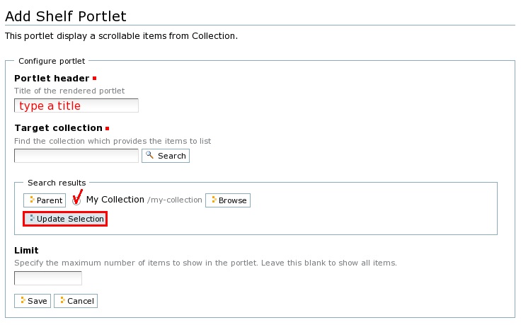 - Portlet shelf is based on the standard Plone collection portlet, so the same fields are available for this type of portlet as for the standard Collection portlet. Fill in the fields in the portlet edit form, specifying a collection that will provide content for the portlet.
