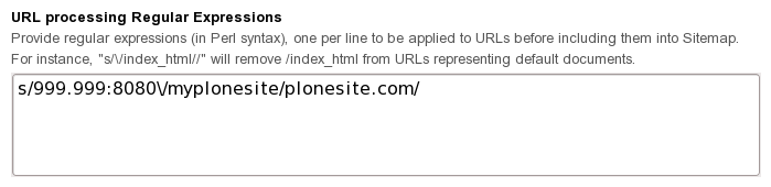 For example: for the site http://plonesite.com we use http://999.999:8080/myplonesite internal URL, so, to c onfigure right sitemap URLs we insert: