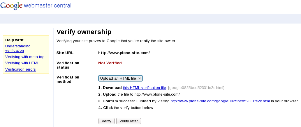 - Verify your ownership by carrying out one of the suggested verification methods: uploading an HTML file with a name they specify, or adding a META tag to your site's index file. We recommend you to choose Upload an HTML file method as it is the most convenient and not so time-consuming as the second one.