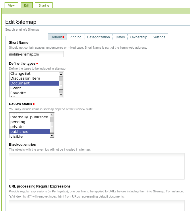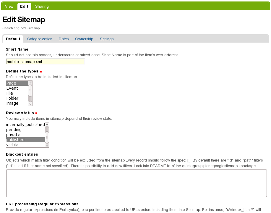 - Blackout entries - objects with the given short names will be removed from the sitemap.