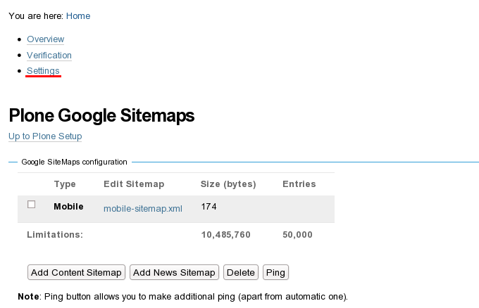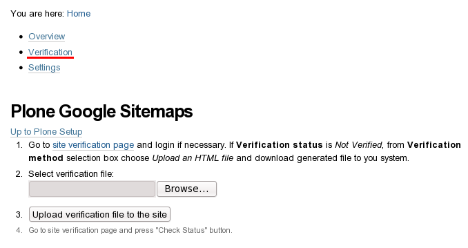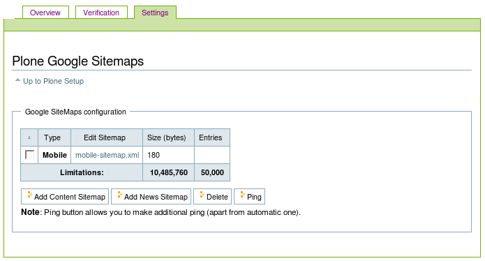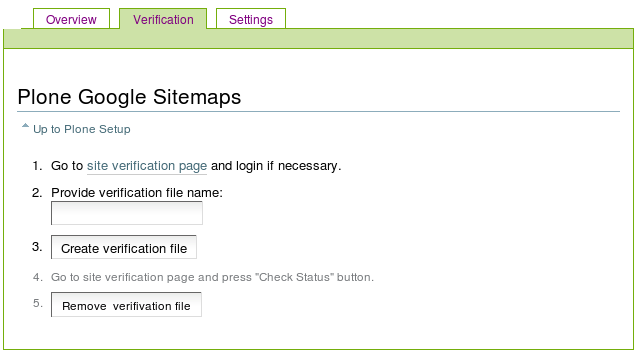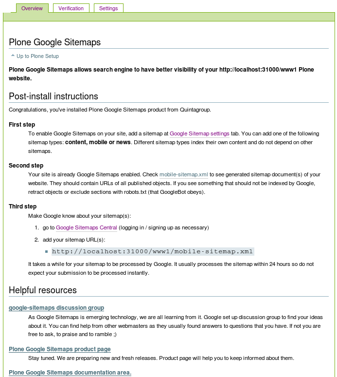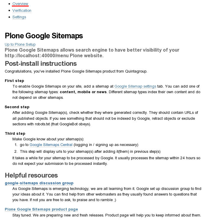 Overview tab includes general information about Plone Google Sitemap product, and step-by-step explanation about how to get to work with it. A list of helpful recourses is also available here.