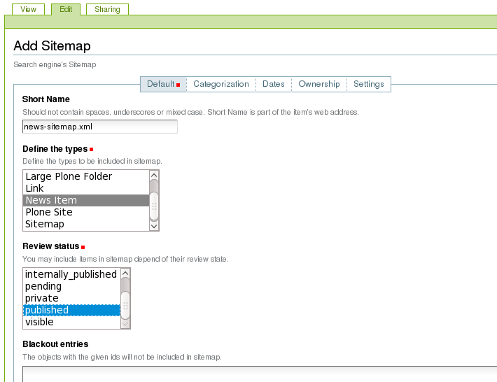 - Define what content should be added to the sitemap by setting necessary parameters on Sitemap Edit Form: