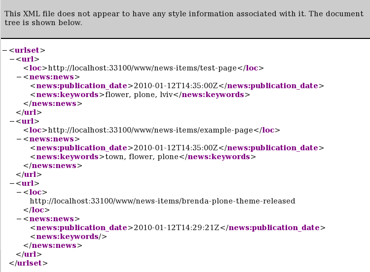 <urlset> <url> <loc>http://localhost:33100/www/news-items/test-page</loc> <news:news> <news:publication_date>2010-01-12T14:32:47Z</news:publication_date> <news:keywords>town, flower, plone</news:keywords> /news:news> </url> <url> ... </url> </urlset>