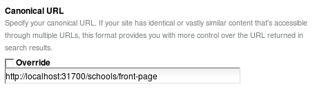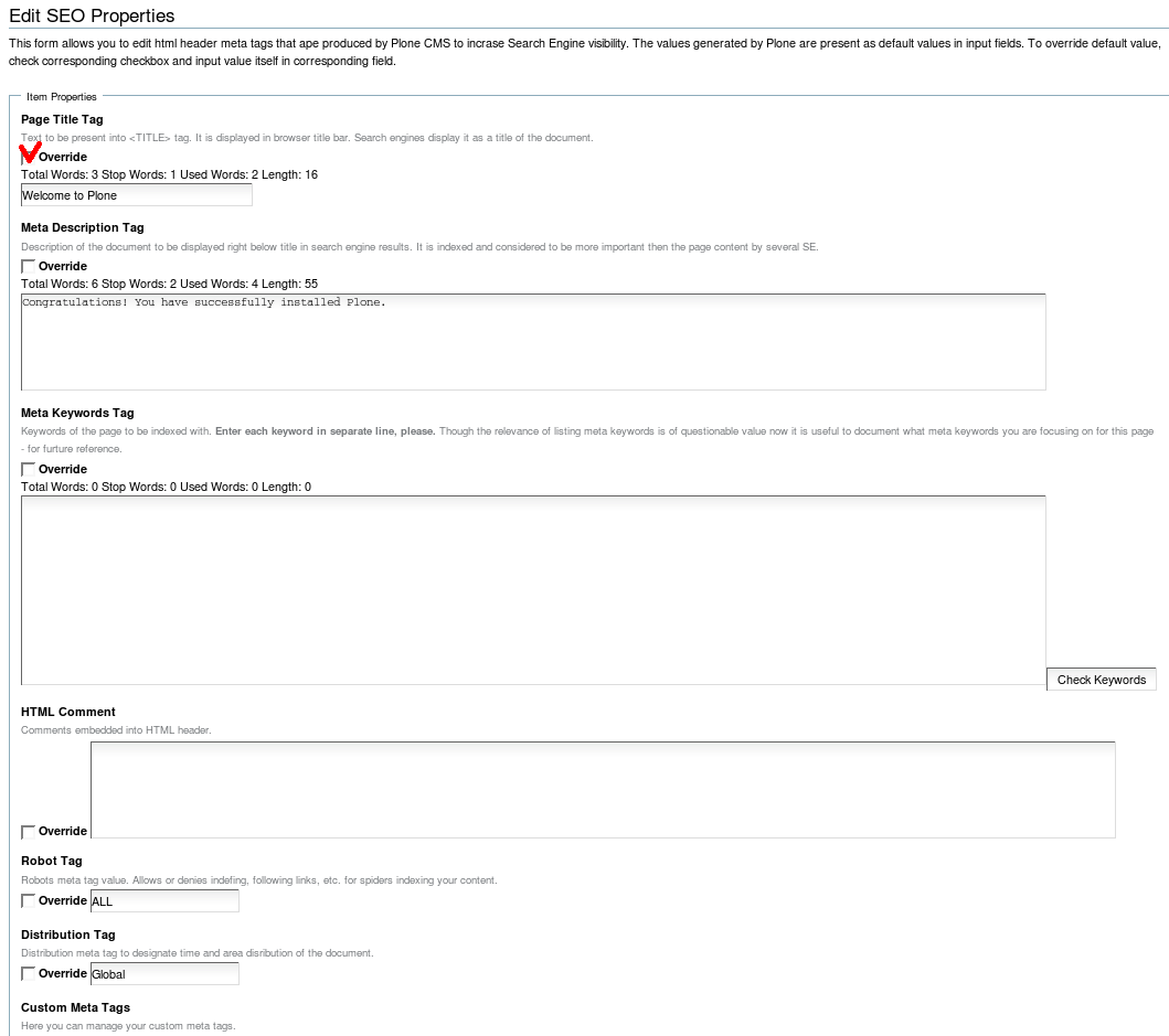 - Check Override boxes for features you want to override and type-in your new SEO values.