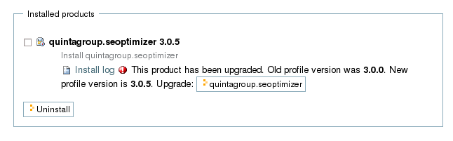 - Run the reinstall procedure: visit "Site Setup" -> "Add-ons" control panel in your Plone site, where you have to press quintagroup.seoptimizer button next to Upgrade. (The same can be done with quickinstaller via ZMI: at /portal_quickinstaller/manage_installProductsForm: check the seoptimizer box and press Reinstall button.) This is an essential step as new version of product can introduce new persistent settings and ways to migrate settings/content from old to new version.