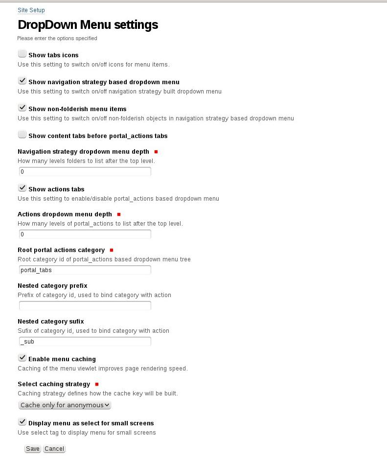 After installation in Plone, you'll see DropDown Menu item under Add-on Configuration, that include the following setting options: