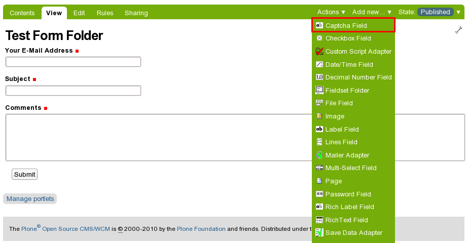 To create forms with the captcha field you need to install the following Plone products. Make sure the products are installed in this order, otherwise they may fail to work correctly: