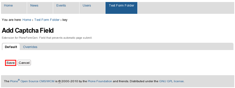 - Captch field is getting its id "key" by default. You only need to save this field.