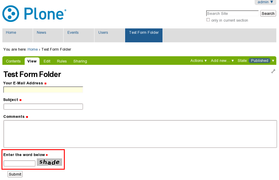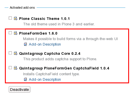 - Quintagroup PloneFormGen CaptchaField (quintagroup.pfg.captcha) - for adding captcha field to the form, it will be installed together with Quintagroup Captcha Core (quintagroup.captcha.core) package that enables Plone captchas on Plone sites.