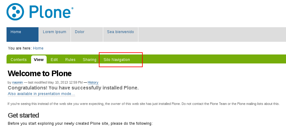 After quintagroup.silogroup product was installed to a Plone site, a new tab is added to a task bar - silo navigation.